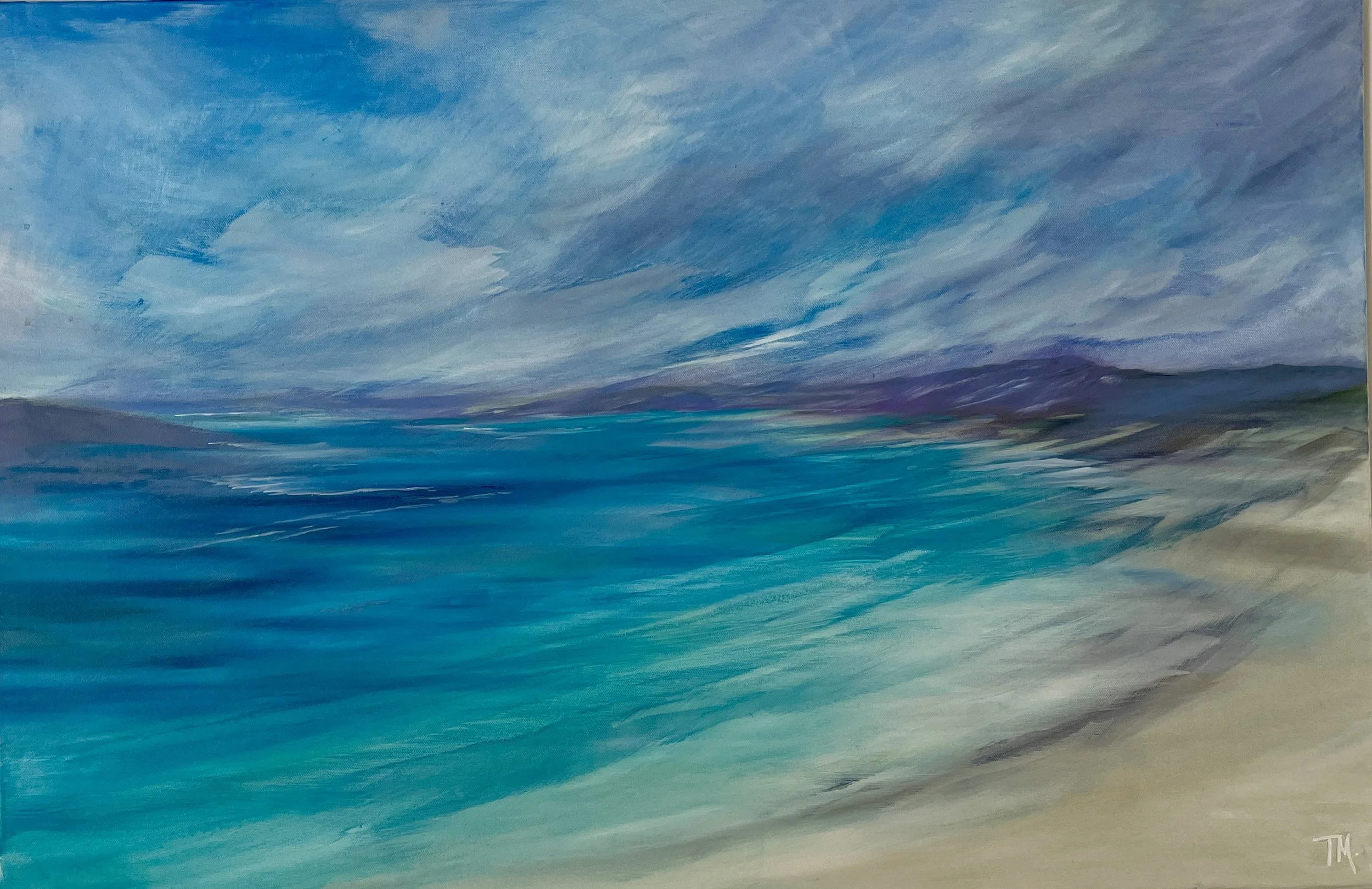 "Painting to me is the glimmer of the sun reflecting off the sea; the wind casting its energy across the sands; a storm cloaking the sky in grey, an endless palette of colours of which to paint"