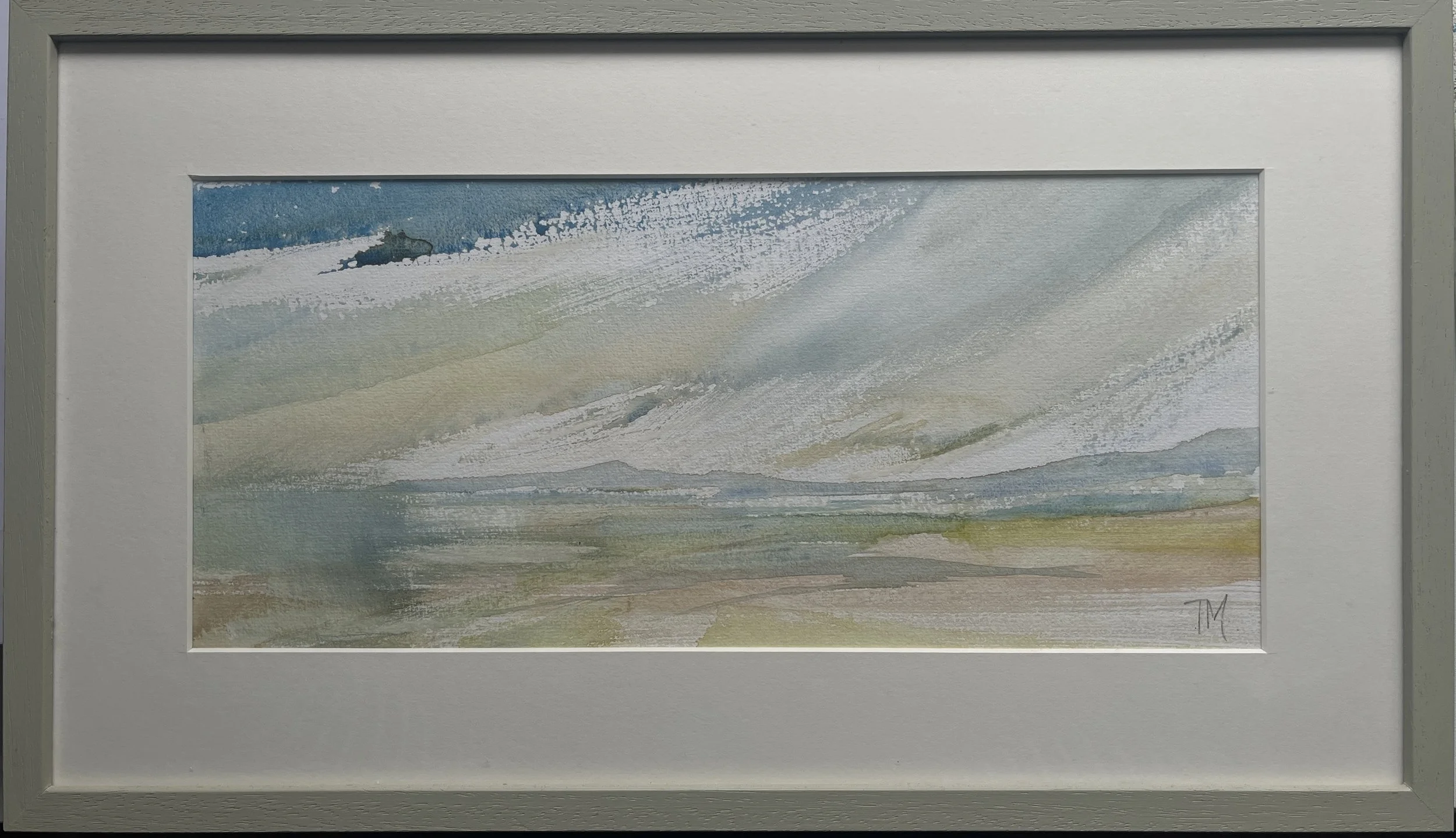 The colour of Firth changes minute by minute and as the tide goes out on springs, the sand is uncovered. The summer sun shone for this sketch and I finished it in the studio later on capturing the swirl of the waves.